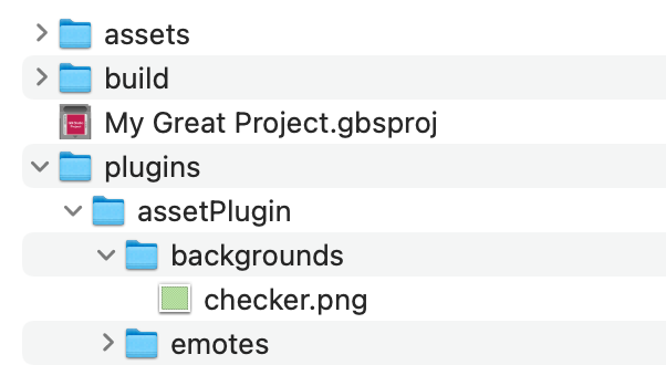 To create an asset plugin first create a new folder within your plugins folder with the name you want to give your plugin (Above we used assetPlugin as the name). Within that folder you can create any of the normal project asset folders (such as backgrounds) and place files within it. These assets will appear as normal in your project but are now easier to package up and share between projects or with others.